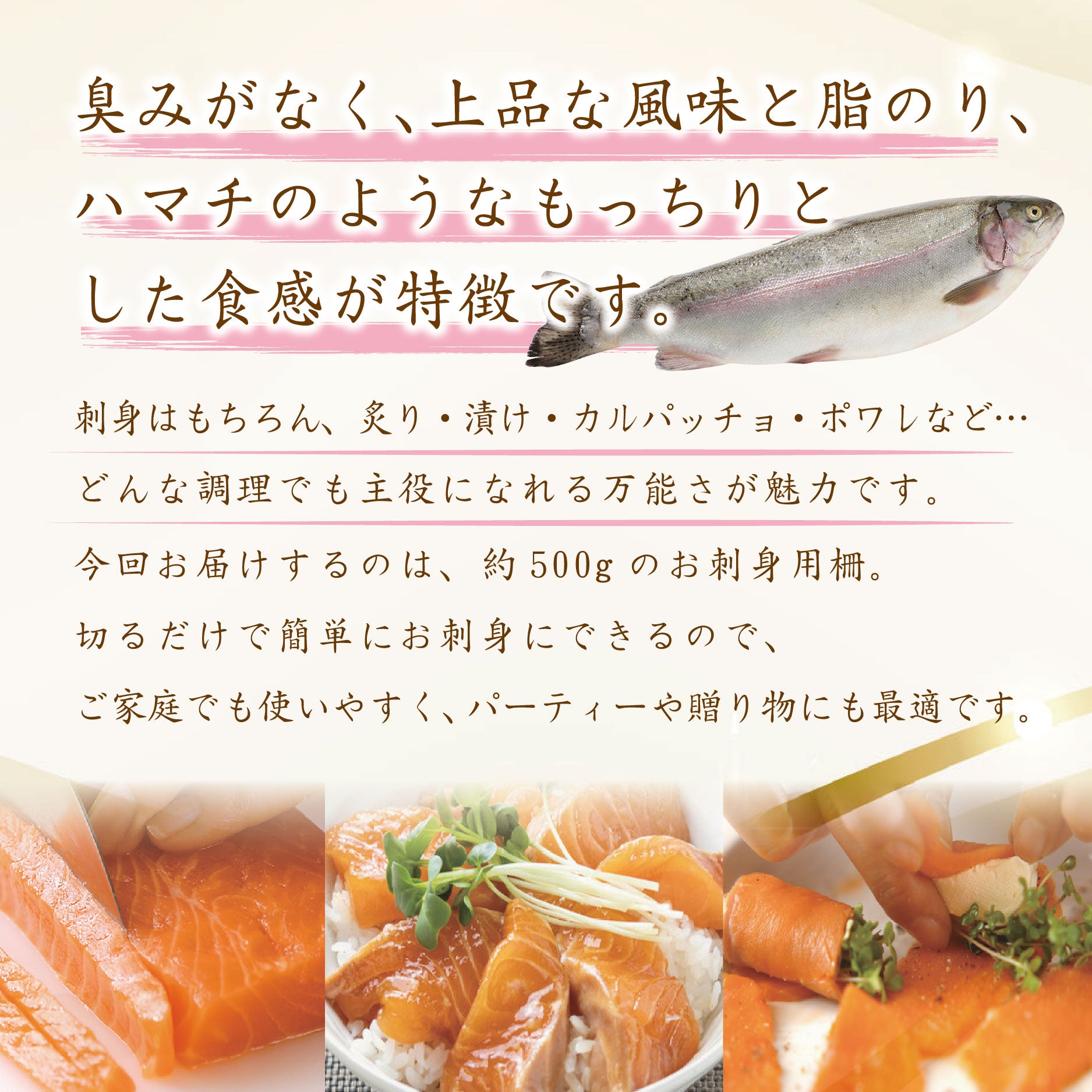 「サーモンが苦手な方にこそ召し上がって頂きたい」魚です。サーモン独特の臭みがなく、食感もプリプリ♪丁寧に職人が処理し、骨や皮も除去したお刺身用の柵でお届けします♪